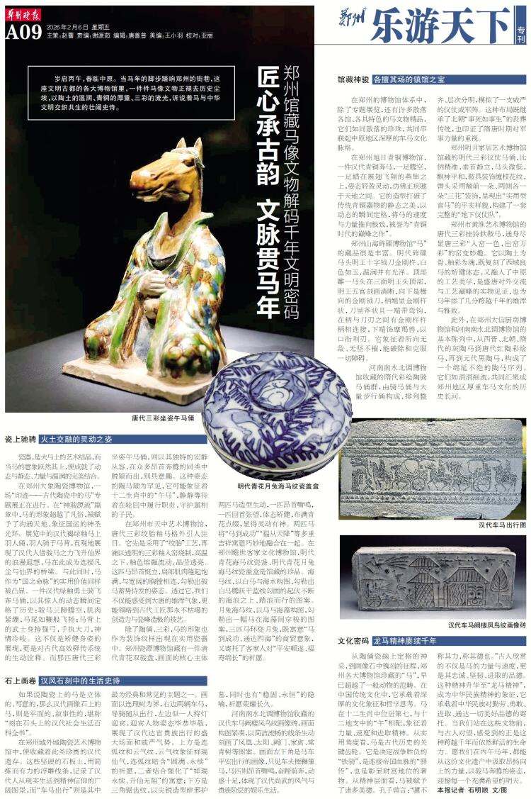 从陶俑瓷碗上定格的神采,到画像石中镌刻的征程,郑州各大博物馆珍藏的“马”,早已超越了一般动物的范畴。在中国传统文化中,它承载着深厚的文化象征和哲学思考。马在十二生肖中位居第七,与十二地支中的“午”相配,象征着力量、速度和进取精神。从实用角度看,马是古代历史的关键齿轮。它是决定战争胜负的“铁骑”,是连接帝国血脉的“驿传”,也是彰显财富地位的奢物。从精神层面看,马被赋予了诸多美德。孔子曾言:“骥不称其力,称其德也。”古人欣赏的不仅是马的力量与速度,更是其忠诚、坚韧、进取的品德。这种精神升华至“龙马精神”,成为中华民族精神的象征,它承载着中华民族对勤劳、勇敢、进取、通达一切美好品德的寄托。当我们站在这些文物前,与古人对望,感受到的正是这种跨越千年而依然鲜活的生命力。愿我们在丙午马年,都能从这份文化遗产中汲取昂扬向上的力量,以骏马奔腾的姿态,迎接每一个充满希望的明天。