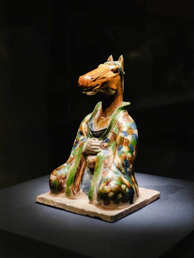 在郑州大象陶瓷博物馆,一场“印迹——古代陶瓷中的马”专题展正在进行。在“神骏源流”篇章中,马的形象超越了凡俗,被赋予了沟通天地、象征国运的神圣光环。展览中的汉代褐绿釉马上羽人俑,羽人骑于马背,直观地展现了汉代人借骏马之力飞升仙界的浪漫遐想,马在此成为连接凡尘与仙界的桥梁。与此同时,马作为“国之命脉”的实用价值同样被凸显。一件汉代绿釉勇士骑飞奔马俑,以其惊人的动态瞬间定格了历史:骏马三蹄腾空,肌肉紧绷,马尾如鞭般飞扬;马背上的武士身挎强弓,手执大刀,神情冷峻。这不仅是矫健身姿的展现,更是对古代高效驿传系统的生动诠释。而那匹唐代三彩坐姿午马俑,则以其独特的安静从容,在众多昂首奔腾的同类中脱颖而出,别具意趣。这种姿态的陶马颇为罕见,它可能象征着十二生肖中的“午马”,静静等待着在轮回中履行职责,守护属相的子民。