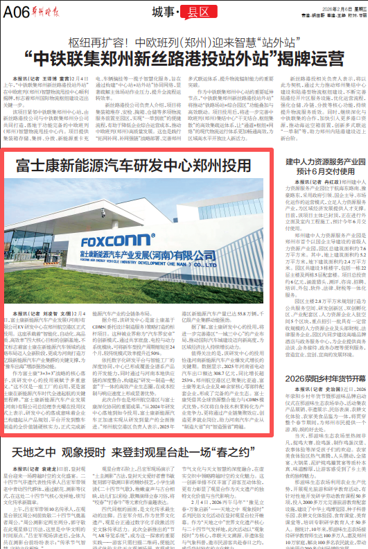 2月4日,富士康新能源汽车产业发展(河南)有限公司EV研发中心在郑州航空港区正式投用。这座承载着“智能化、自动化、高品质、高效率”四大核心目标的创新基地,不仅标志着富士康在新能源汽车领域的战略布局迈入全新阶段,更成为河南打造万亿级新能源汽车产业集群的关键支撑,为“豫车出海”增添强劲动能。