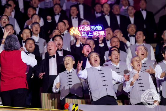 晚会现场,来自包括文旅军团合唱团在内的13支合唱团共1200名队员齐聚,他们轮番拉歌,此起彼伏。洪亮而深情的歌声不仅点燃了现场氛围,更唤起了全国直播观众集体最温暖的回忆。