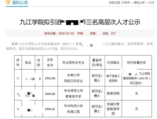 近日,九江学院发布一则拟引进三名高层次人才的公示。其中一名拟引进人才的父亲是该校退休教师,学校对此亲属关系进行了公开公示。这一举动引发网友讨论。工作人员表示,亲属回避制度适用于有上下级领导关系的职务,普通教师无需实行亲属回避制度。