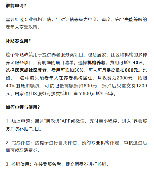 河南省近期全面实施面向中度以上失能老年人的养老服务消费补贴政策。该政策以消费券形式发放,用于抵扣相关养老服务费用。