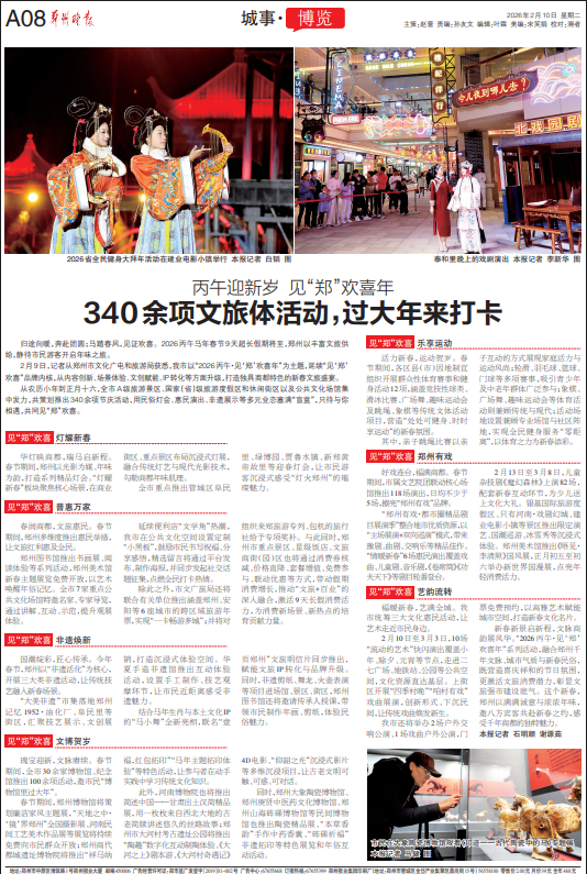 2月9日,记者从郑州市文化广电和旅游局获悉,我市以“2026丙午·见‘郑’欢喜年”为主题,延续“见‘郑’欢喜”品牌内核,从内容创新、场景体验、文创赋能、IP转化等方面升级,打造独具商都特色的新春文旅盛宴。