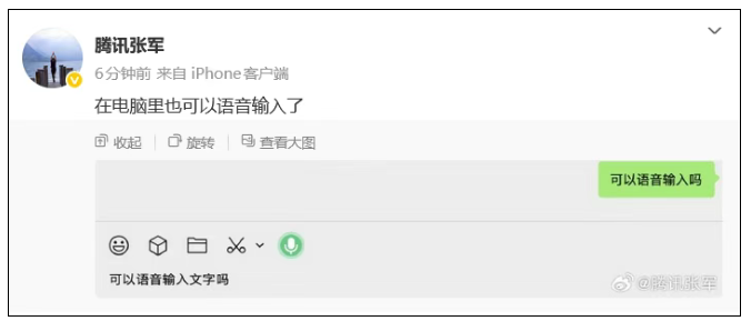 2月13日,腾讯公司公关总监张军发文称,“在电脑里也可以语音输入了。”配图是电脑微信界面。
