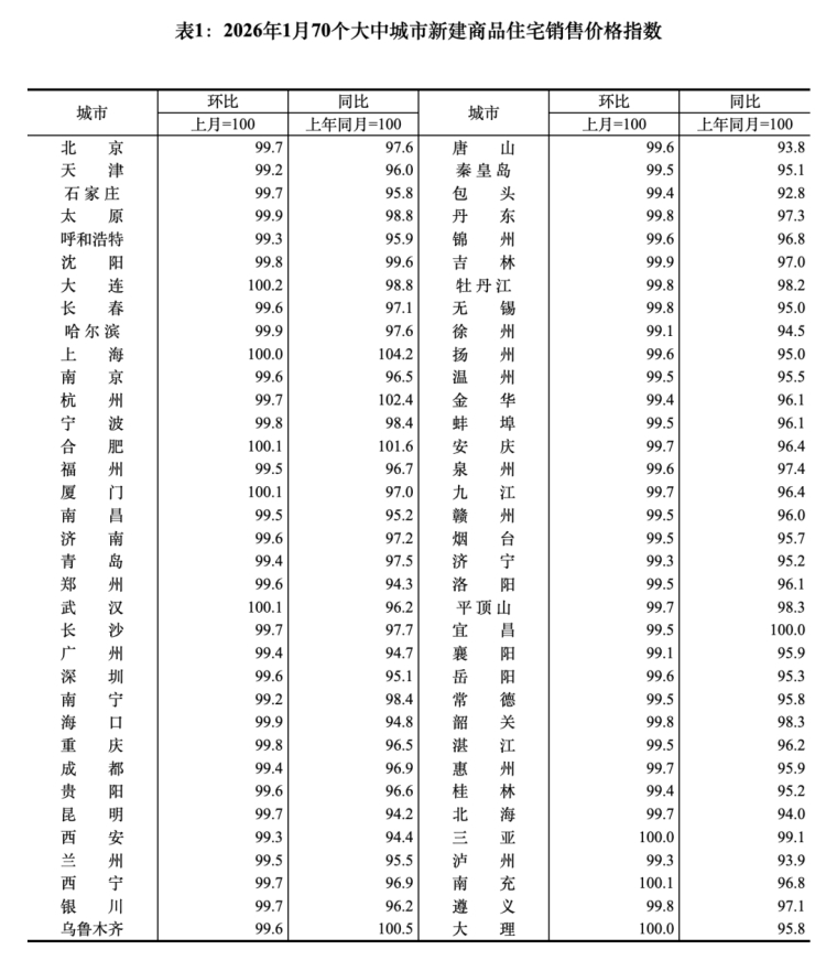 国家统计局的最新数据显示,2026年1月份,70个大中城市商品住宅销售价格环比降幅总体收窄、同比下降。