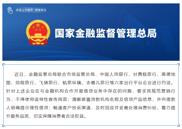 近日,金融监管总局联合市场监管总局、中国人民银行,对携程旅行、高德地图、同程旅行、飞猪旅行、航旅纵横、去哪儿旅行等六家出行平台企业进行约谈。