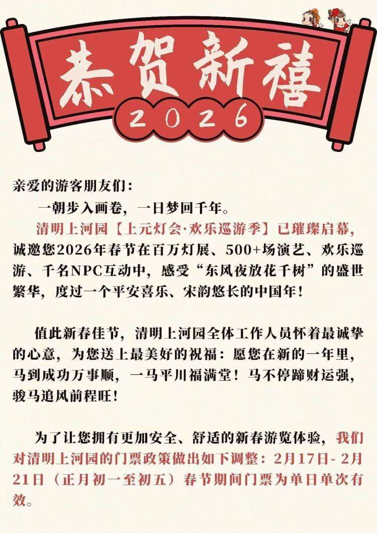 3月1日至31日,凭本人春节期间的购票记录及身份证,可不限次数免费游清明上河园。