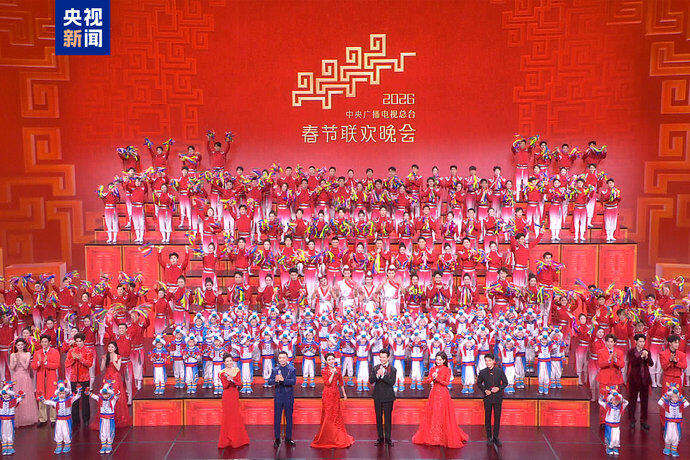 中央广播电视总台《2026年春节联欢晚会》在“欢乐吉祥,喜气洋洋”的主基调中圆满播出,为全球华人和海外朋友奉上了一道年味浓郁、文化醇厚、科技闪耀的“文化年夜饭”,传递出和合共鸣、四海同春的浓浓暖意。截至2月17日8时,春晚境内全媒体总触达230.63亿次,同比提升37.3%。在全国电视市场的直播总收视份额达79.29%,创13年来新高。春晚播出期间,平均每分钟同时在线收看(收听)人数达3.25亿人,同时在线收看人数峰值破4亿人。