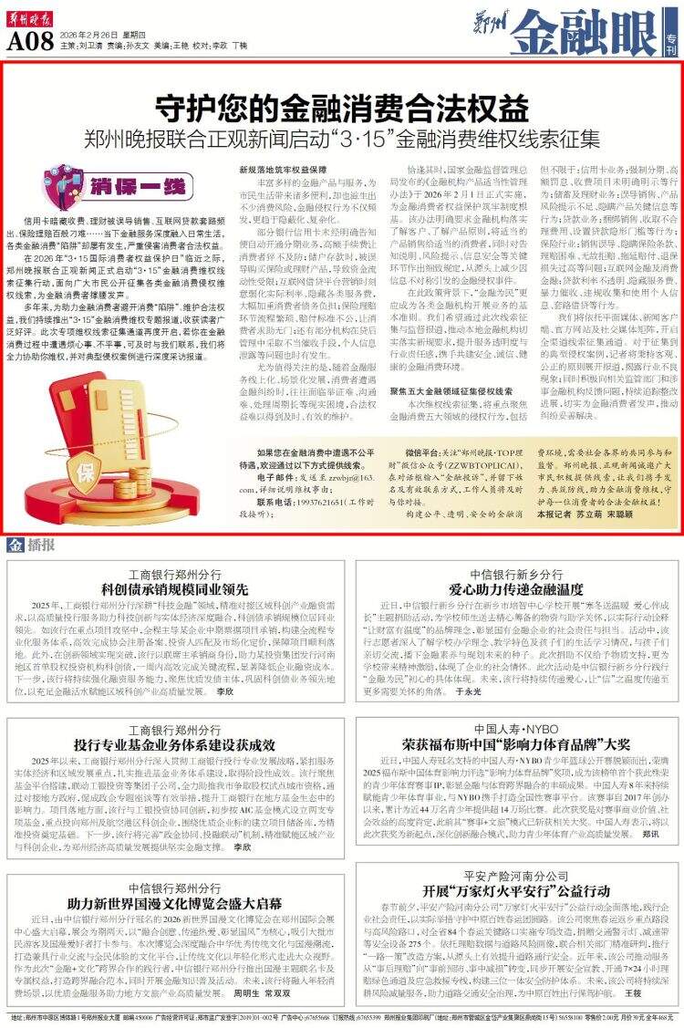 在2026年“3·15国际消费者权益保护日”临近之际,郑州晚报联合正观新闻正式启动“3·15”金融消费维权线索征集行动,面向广大市民公开征集各类金融消费侵权维权线索,为金融消费者撑腰发声。