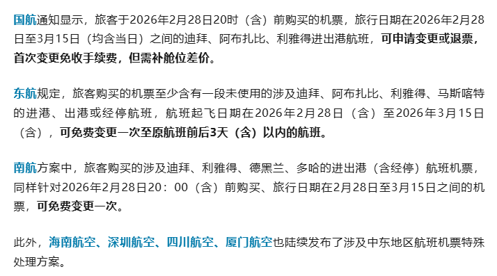 2月28日晚,受中东局势影响,国航、东航、南航等国内多家航空公司相继发布了涉及中东地区航班机票特殊处理方案。