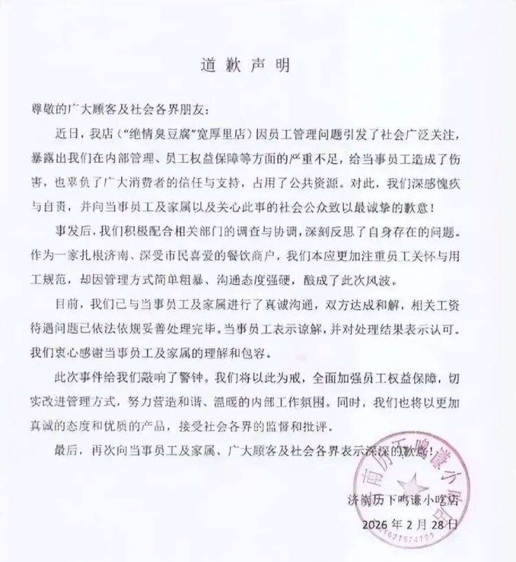 山东济南“绝情臭豆腐”员工维权事件于2月28日有了新进展。涉事商家“绝情臭豆腐”店公开道歉:承认“在内部管理、员工权益保障等方面存在严重不足”,当事人:父亲已获赔偿,部分赔款已捐赠公益。