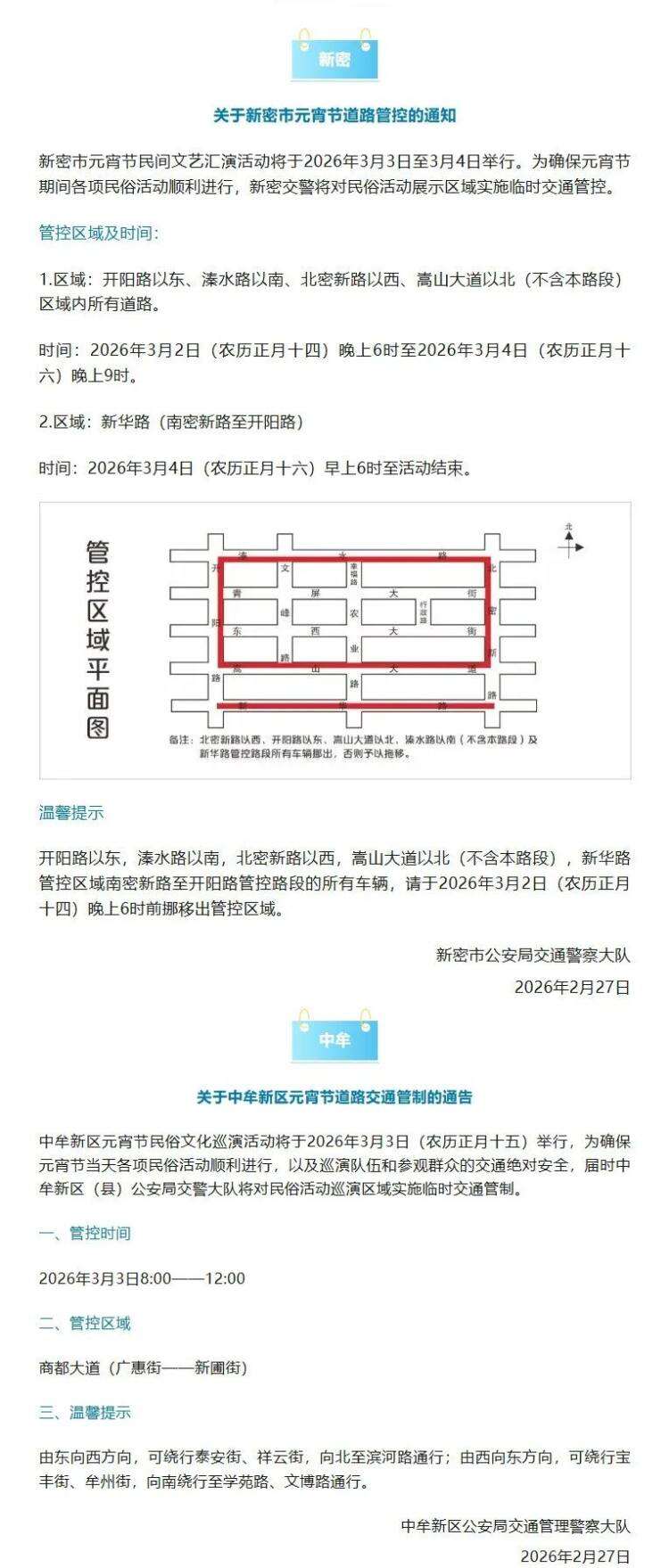 新密、中牟27日发布元宵节道路交通管制的通告↓↓↓