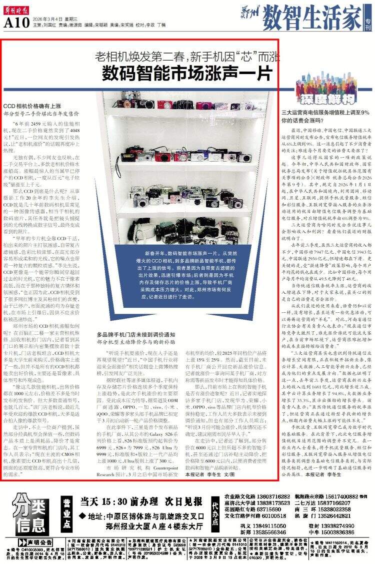 新春开年,数码智能市场涨声一片。从突然爆火的CCD相机,到多品牌新品智能手机,都传出了上涨的信号。前者是因为自带复古滤镜的出片效果,迅速引爆市场;后者则是因为手机内存及储存芯片的价格上涨,导致手机厂商采购成本压力增大。对此,郑州市场有何反应,记者近日进行了走访。