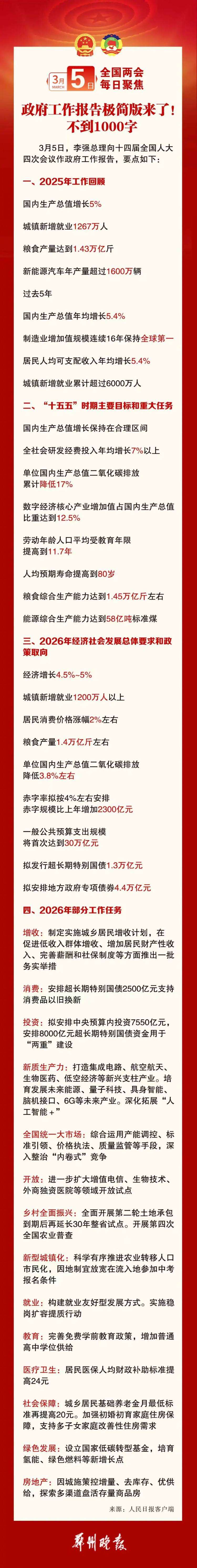 3月5日上午,十四届全国人大四次会议在北京开幕,国务院总理李强作政府工作报告。一张图,带你了解2026年政府工作报告。