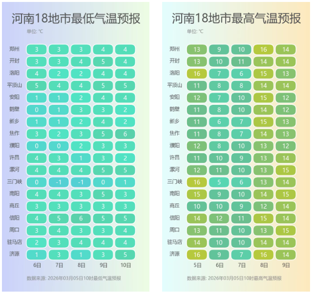新一轮弱雨雪天气又将再度上线。3月6日,河南多云转阴天,西部、西北部部分县(市、区)有小雨转雨夹雪或小雪,局部中雪;其他县(市、区)有小雨或零星小雨。全省东北风3到4级,阵风6级左右。明后两天,大部地区最高气温从今天的10℃出头(西部15℃+)滑落至个位数,最低气温则维持在3℃上下。预计本周日开始,随着一连串晴或多云天气的到来,河南的气温将再度踏上回升之旅。
