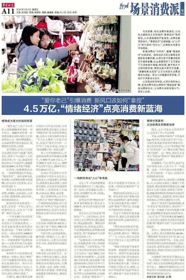 马年新春,各地消费热潮涌动,从马年主题联名文创热销到“票根经济”跨界联动,从非遗国潮到疗愈服务,消费场景悄然迭代,“情绪经济”加速破圈,以“心价比”取代单纯“性价比”,以情感共鸣激活市场潜能。