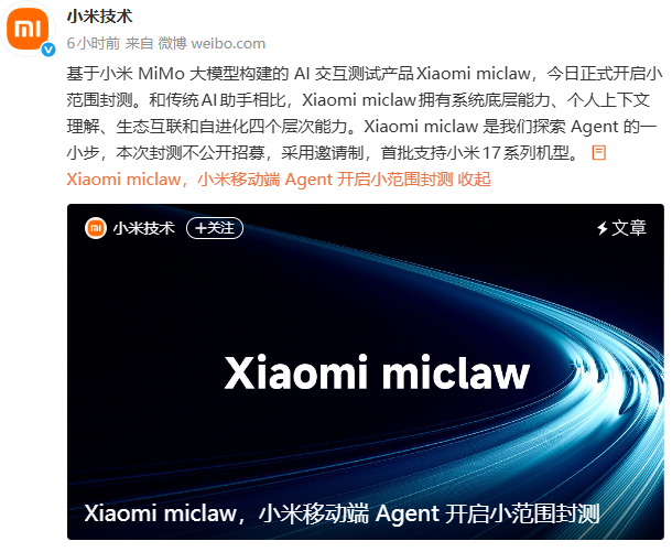 3月6日,小米发布移动端Agent产品“Xiaomi miclaw”,正式开启小范围封测,首批支持小米17系列机型。