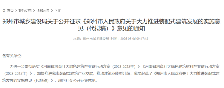 3月6日,郑州公开征求装配式建筑发展意见,意见征集截止至4月6日。意见稿提出,到2026年底,郑州全市装配式建筑占新建建筑的面积比例达到50%以上。力争到2030年底,全市装配式建筑占新建建筑的面积比例达到60%以上。公积金贷款购买此类住房额度最高上浮20%,还给予企业信贷、税收等多项政策支持。