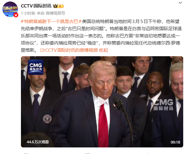 美国总统特朗普当地时间3月5日下午称,他希望先结束伊朗战争,之后“古巴只是时间问题”,委内瑞拉局势已经稳定。