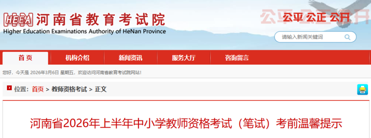 2026年上半年中小学教师资格考试(笔试)将于3月7日进行,河南省教育考试院发布温馨提示:电子身份证不作为考试入场有效证件使用。