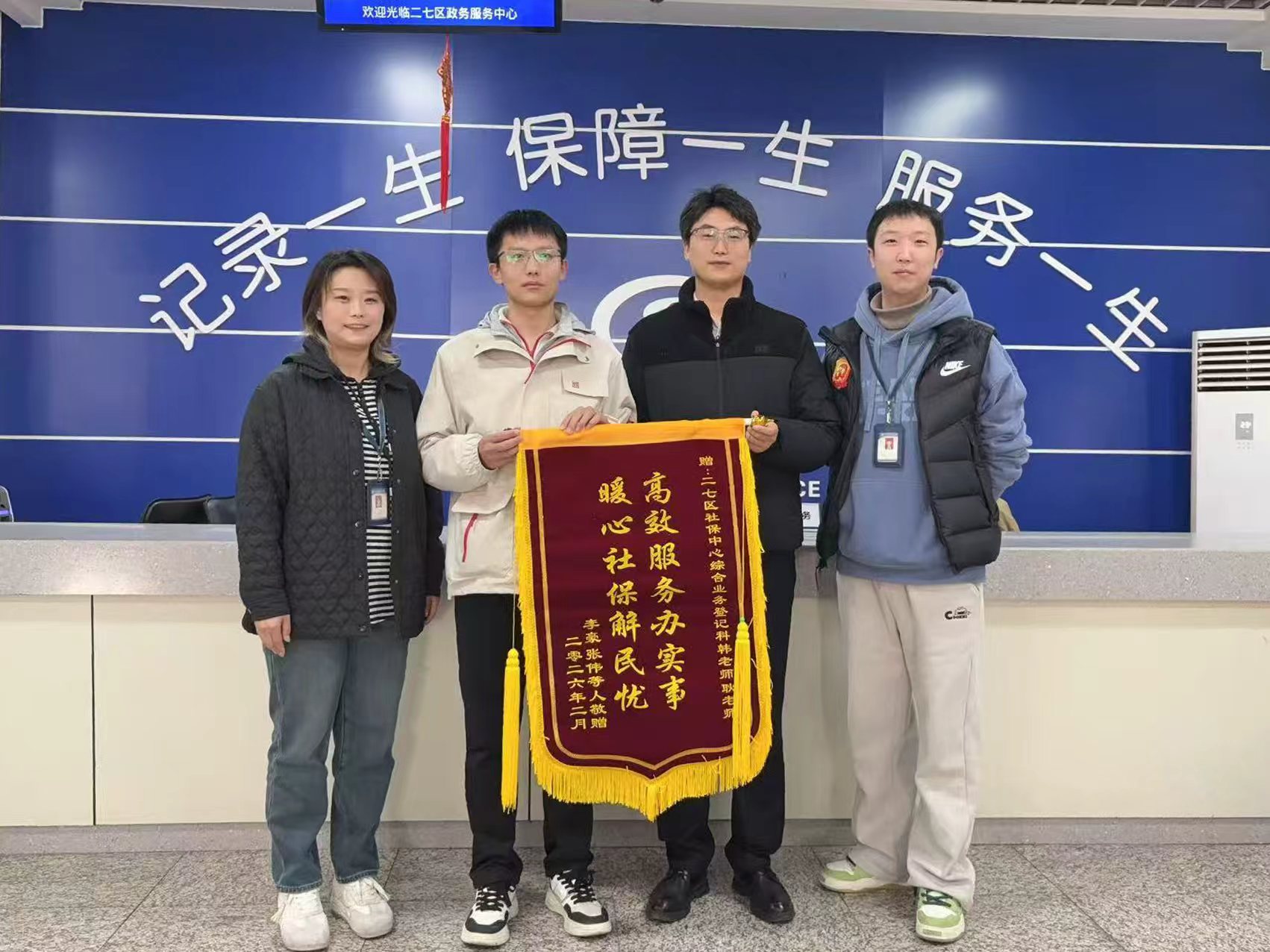 3月13日,二七区社保中心收到了一份特殊而朴素的礼物——一面红彤彤的锦旗,锦旗上绣着:“高效服务办实事,暖心社保解民忧”。送来锦旗的,是某物流公司的几名前员工代表。