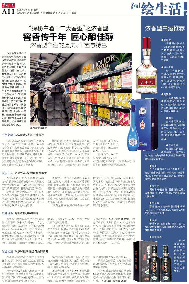 作为中国白酒市场的主流香型,浓香型白酒以其窖香浓郁、绵甜醇厚的独特风味,俘获了亿万消费者的青睐,长期占据行业产销量半壁江山。数据显示,2025年浓香型白酒仍以47%的市场份额稳居行业第一,在“酱香主导、清香崛起”的格局中保持稳固地位。从千年窖池传承到现代工艺创新,从舌尖口感体验到专业品鉴之道,再到各具特色的代表品牌,浓香型白酒承载着中国酿酒文化的深厚底蕴,彰显着中式酿造的匠心智慧。近日,记者走访行业专家、酒企负责人及资深品鉴师,全方位解码浓香型白酒的核心魅力。