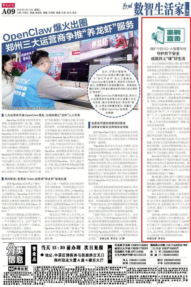 郑州移动在这里搭建了一张满足智慧矿山全场景应用的5G-A专网,井下已部署5G基站39个,巷道覆盖距离6800米,支持上百路高清摄像仪数据回传。