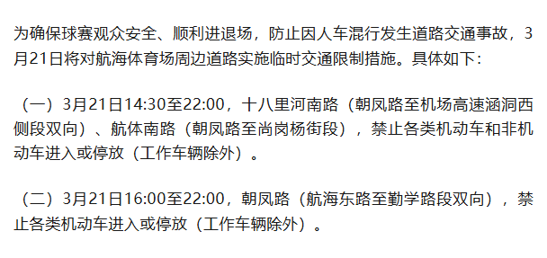 3月21日19:00,2026中超联赛(河南赛区)河南俱乐部VS武汉三镇的比赛将在郑州航海体育场举行。当日14:30至22:00,航体周边多条道路实施临时交通管制,禁止无关车辆通行停放。