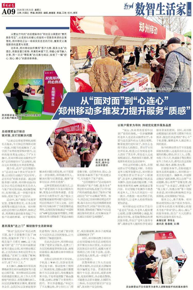 从营业厅内的“总经理接待日”到社区公园里的“惠民服务专区”,从适老化的暖心改造到十项服务承诺的全面落地,郑州移动正以一场场实实在在的行动,重新定义通信服务的温度与深度。