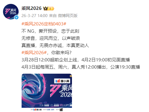 3月27日,综艺节目《乘风2026》公开嘉宾阵容,宣布节目将于4月2日开启直播。节目采用“直播”模式作为节目公演核心呈现方式,邀请30余位女性嘉宾登台挑战。