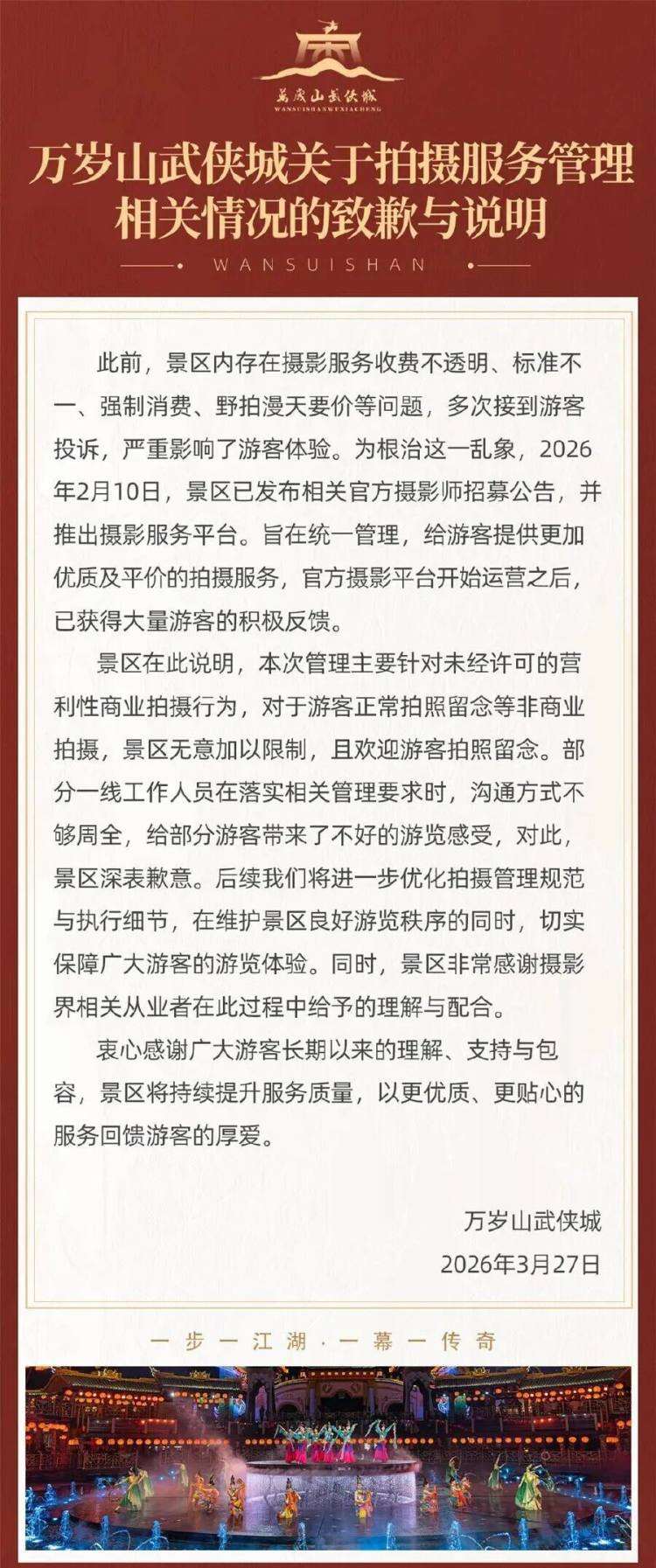 3月27日,万岁山武侠城发布关于拍摄服务管理相关情况的致歉与说明: