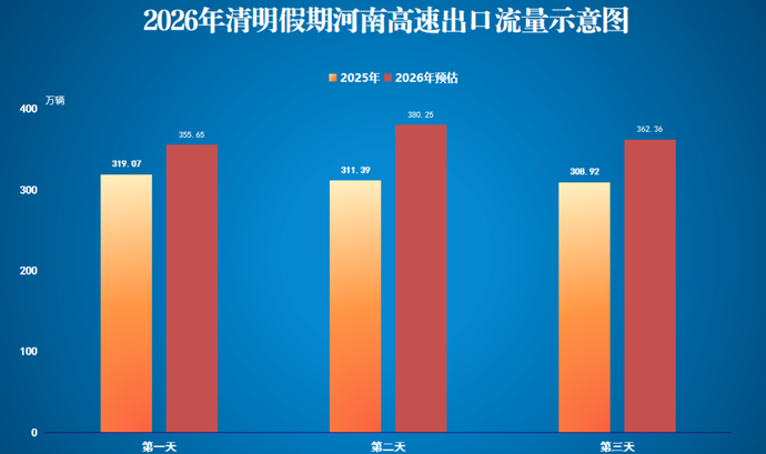2026年清明假期,全省高速公路出行以祭扫、近郊踏青的中短途自驾流为主,跨省长距离出行需求相对有限,预计路网整体运行平稳有序。受假期出行集中效应影响,环郑州周边路段、重点景区及墓区衔接道路将出现短时潮汐式车流聚集,易发生阶段性缓行。假期全省高速公路出口总流量预计约1100万辆,较2025年同比增长14.82%;日均流量约367万辆,流量峰值将集中出现在假期首日上午及假期最后一天下午返程时段。建议公众错峰出行、合理规划路线,途经易拥堵路段谨慎驾驶,确保通行安全顺畅。