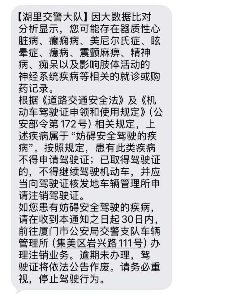 就诊购药记录被大数据筛查?网友购买助眠药后收到交警短信,提醒30日内办理驾驶证注销业务。对此,交警回应:短信只是提醒,建议线下核实。