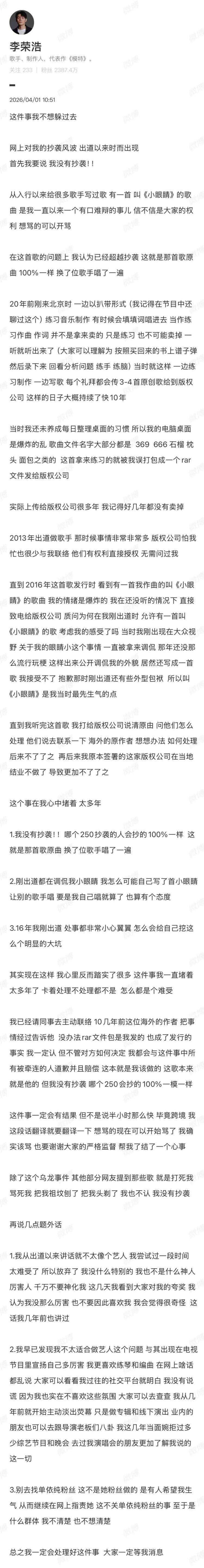 4月1日,歌手李荣浩发长文回应《小眼睛》被指抄袭:误将练习曲发给版权公司,后因公司倒闭沟通中断,致署名作曲的歌被发行,已主动联系原作者处理赔偿。