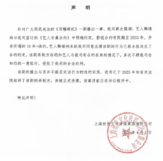 4月1日,丝芭传媒再发声明:与鞠婧祎影视合约有限期至2033年,其未经同意出演《月鳞绮纪》属违约,已起诉该剧承制方,该案正在诉讼程序中。据悉,该剧定档今日播出。