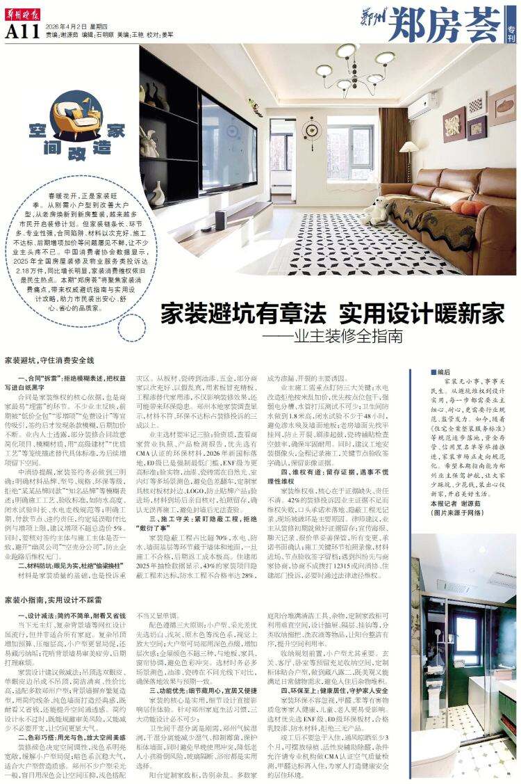 春暖花开,正是家装旺季。从刚需小户型到改善大户型,从老房焕新到新房整装,越来越多市民开启装修计划。但家装链条长、环节多、专业性强,合同陷阱、材料以次充好、施工不达标、后期增项加价等问题屡见不鲜,让不少业主头疼不已。中国消费者协会数据显示,2025年全国房屋装修及物业服务类投诉达2.18万件,同比增长明显,家装消费维权依旧是民生热点。本期“郑房荟”将聚焦家装消费痛点,带来权威避坑指南与实用设计攻略,助力市民装出安心、舒心、省心的品质家。