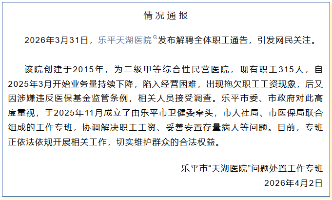 4月2日,江西乐平通报“一民营医院解聘全体职工”:已成立专班协调解决职工工资、安置病人等问题。