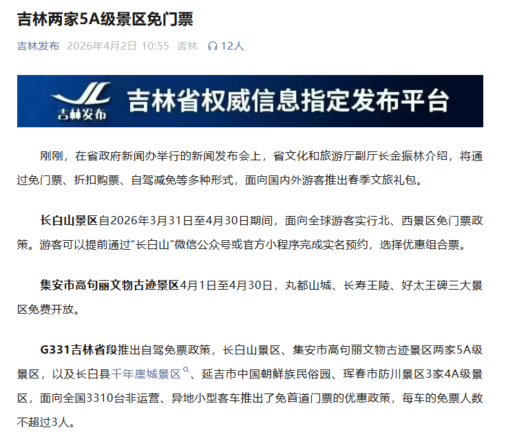 长白山景区自2026年3月31日至4月30日,面向全球游客实行北、西景区免门票政策。游客可以提前通过“长白山”微信公众号或官方小程序完成实名预约,选择优惠组合票。集安市高句丽文物古迹景区自4月1日至30日,丸都山城、长寿王陵、好太王碑三大景区免费开放。