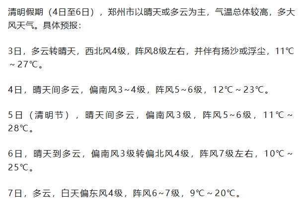 据河南省气象台消息,预计清明假期(4月4日至6日),河南省以晴好天气为主;西部、北中部多7级左右大风;全省大部最高气温在20℃以上,5日达26℃~30℃。整体天气情况有利于假期出行。