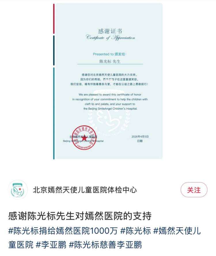 4月7日,北京嫣然天使儿童医院发文感谢慈善家陈光标捐款1000万元,并晒出感谢证书。此前陈光标将准备赠予张雪的劳斯莱斯变现,捐赠给嫣然医院。