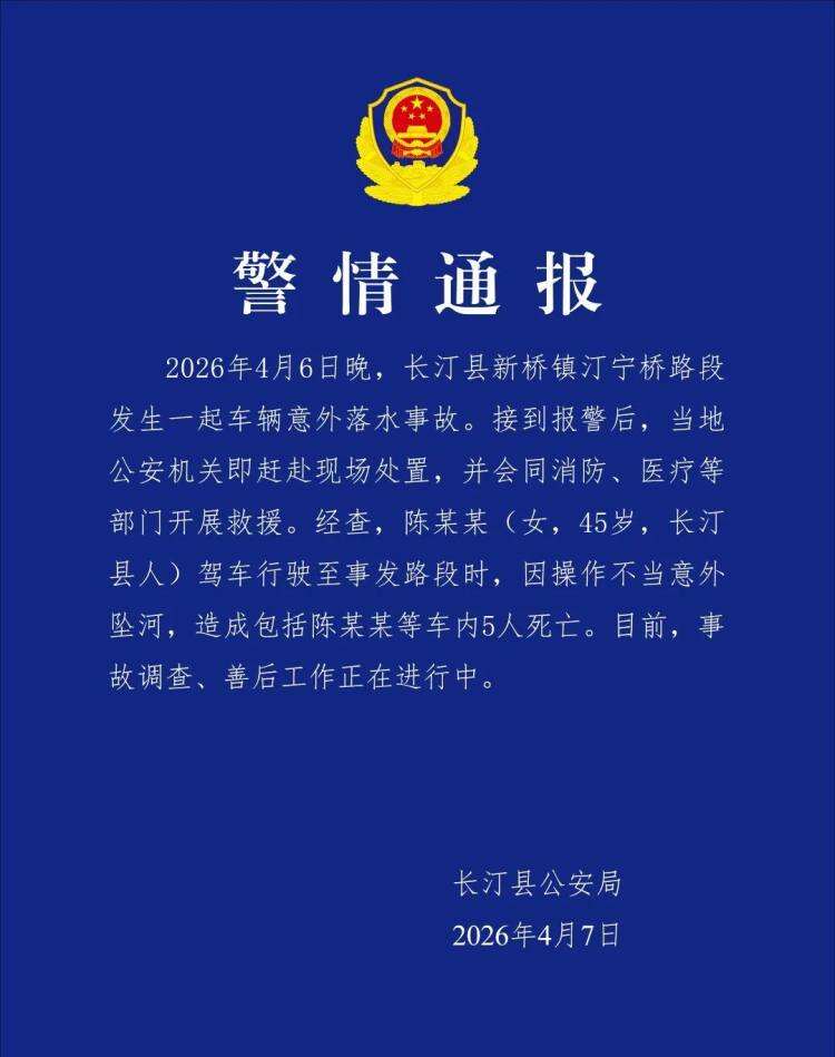 4月7日,福建省长汀县公安发布警情通报:陈某某(女,45岁)驾车操作不当意外坠河,造成车内5人死亡。