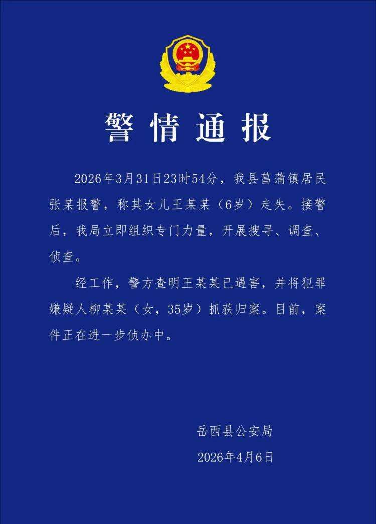 安徽岳西县公安局6日发布警情通报:一名6岁失联女童确认遇害,犯罪嫌疑人柳某某(女,35岁)被抓获归案。