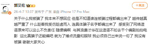 4月7日,中国篮球运动员郭艾伦在个人社媒发文辟谣,否认了自己被骗千万元的传闻:我没有被骗,谢谢大家关心!