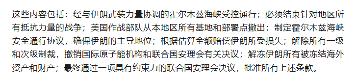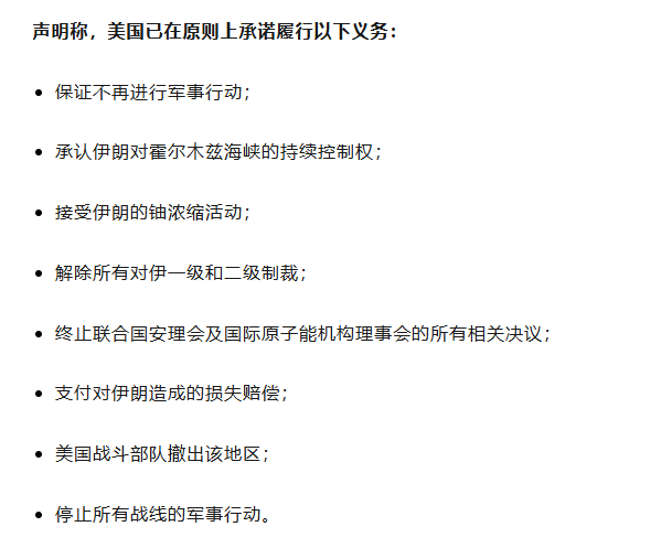 伊朗最高国家安全委员会8日发表声明,公布了通过巴基斯坦向美国方面提交的10项停战条款主要内容。