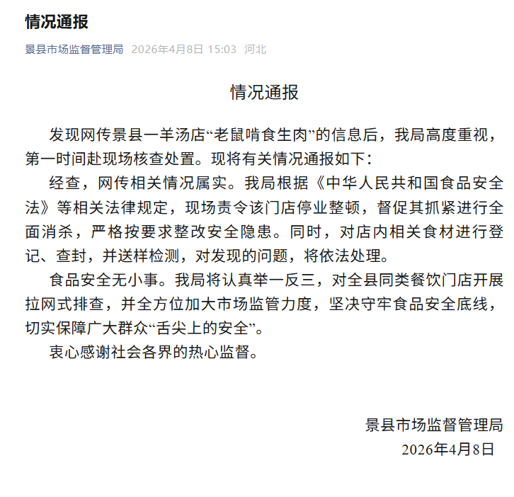 4月8日,河北景县通报“羊汤店内老鼠啃食生肉”:属实,责令该门店停业整顿、全面消杀,对店内相关食材进行登记、查封,并送检,将加大监管力度。