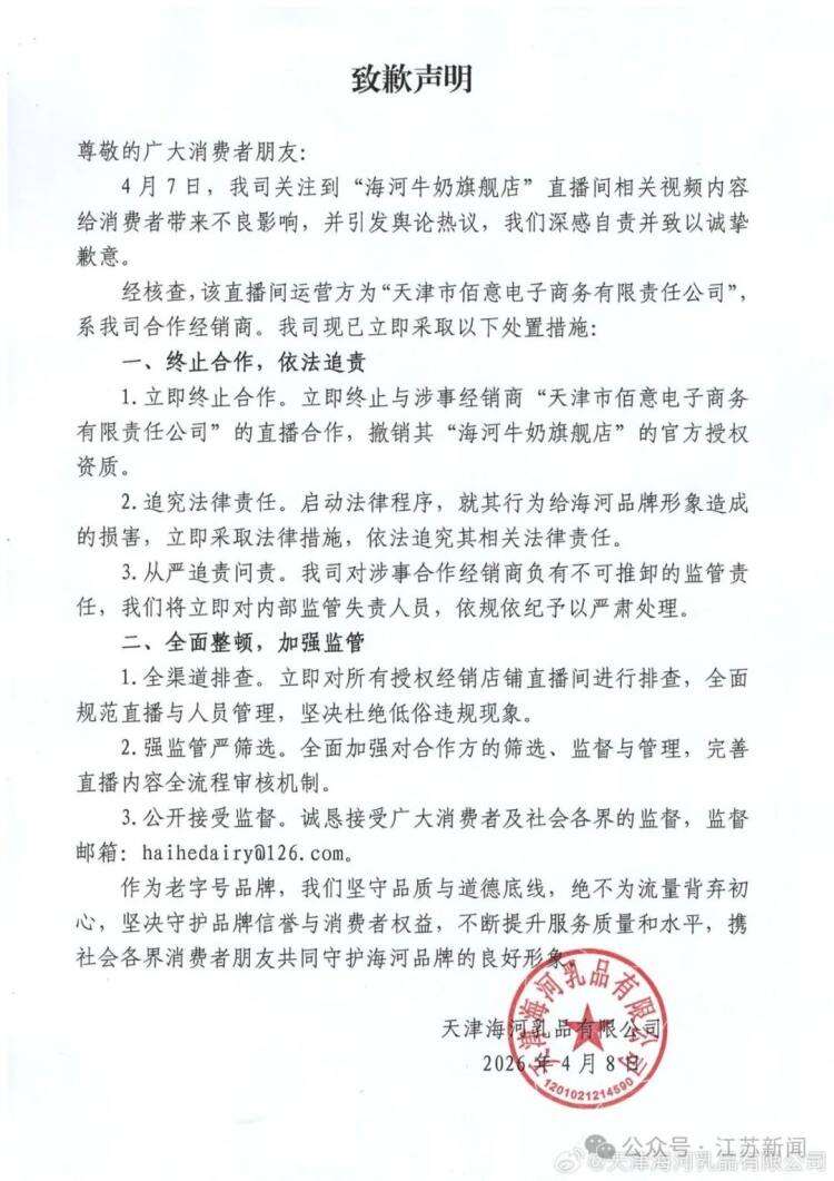 4月8日,海河乳品就“男主播发表涉黄言论”致歉:系合作经销商,已立即终止合作并启动法律程序,将全渠道排查;此前直播间出现涉及“性暗示”“性交易”内容,还有不雅动作。