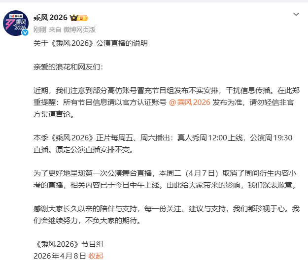 4月8日,仿冒账号@乘风2026 微博 因造谣《乘风2026》取消直播改录播被微博封号,该账号多次仿冒官方造谣屡教不改。节目组同日辟谣,确认公演直播安排不变,仅取消了4月7日小考直播,相关内容已上线,提醒网友认准官方认证账号。