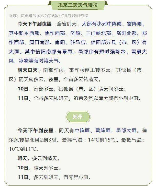 据河南气象,今天下午到夜里是主要的降雨时段,全省大部有小到中阵雨、雷阵雨,其中新乡西部、焦作西部、济源、三门峡北部、洛阳北部、郑州西部、周口南部、南阳、驻马店、信阳部分地区有大雨,其中信阳南部有暴雨,局部伴有短时强降水、雷暴大风、冰雹等强对流天气。明天起再度回升,本周五前后大部地区预计升至25℃上下。