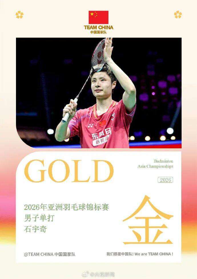 2026年亚洲羽毛球锦标赛男单决赛,中国选手石宇奇2:0战胜印度选手阿尤什·谢蒂,首次夺得该项赛事冠军。