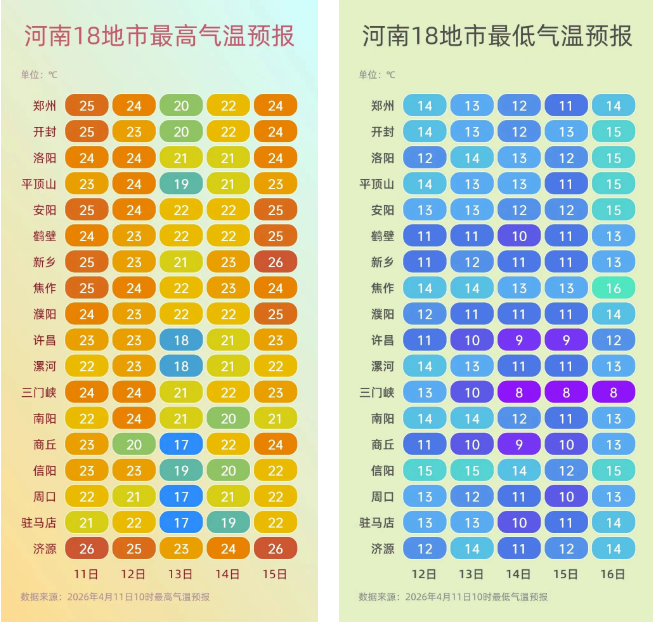据河南气象,今天夜里到13日,东部、南部阴天,有小雨或零星小雨。下周一冷空气登场,全省大部最高气温将降至20℃上下。而到了15日,多地最高气温又将重回25℃附近。